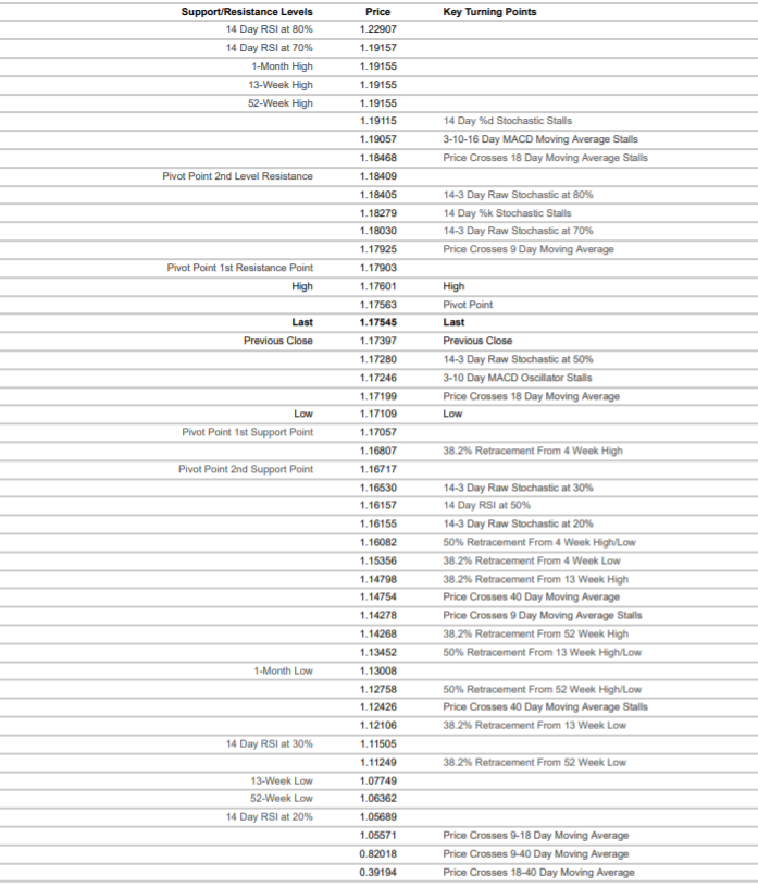 Níže zobrazený „technický stromek“ zobrazuje klíčové úrovně (indikátory, cenová maxima a minima, pivotní body, klouzavé průměry či Fibonacciho úrovně) pro měnový pár EUR/USD.