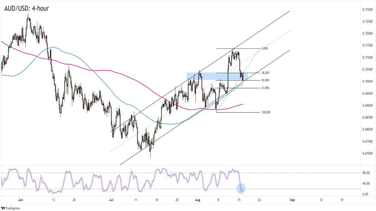 Měnový pár AUD/USD se na 4hodinovém grafu obchoduje v rostoucím trendovém kanálu. Aktuálně dochází k odrazu směrem vzhůru od již dříve prolomené oblasti rezistence (throwback - nyní support), která koresponduje s úrovní 50 % Fibonacciho retracementu. Indikátor Stochastic současně již vysílá přeprodané podmínky, další pokles tak může být limitován. Najdou kolem současných úrovní znovu sílu býci a posílíme zpět směrem k rezistenci trendového kanálu nebo alespoň k jeho středové linii?