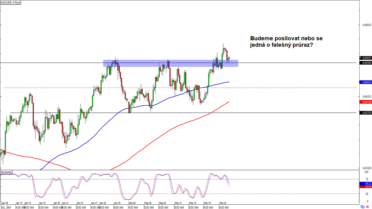 Měnový pár AUD/USD na 4hodinovém grafu aktuálně testuje již dříve prolomenou oblast rezistence obchodního pásma (throwback - nyní support) kolem hladiny 0,6550. Najdou kolem současných úrovní znovu sílu býci a dočkáme se tak dalšího růstu tohoto měnového páru? Indikátor Stochastic současně již ale opustil překoupenou oblast, mohlo by se tak naopak jednat o falešný průraz.