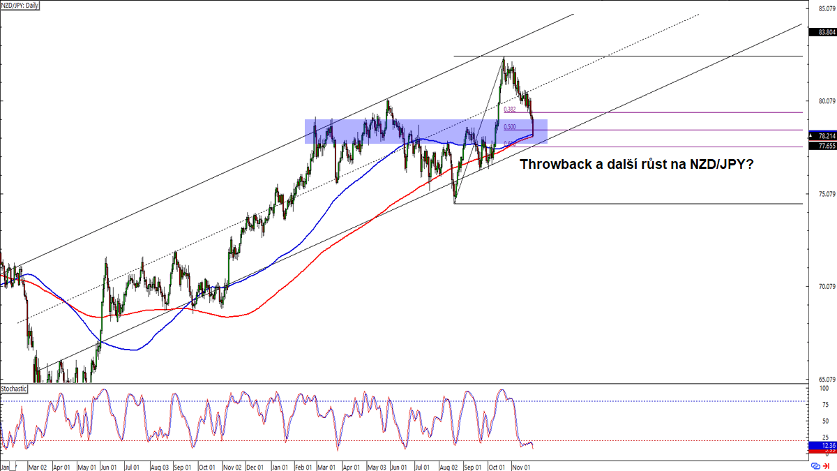 Měnový pár NZD/JPY se na denním grafu obchoduje v rostoucím trendovém kanálu. Aktuálně testuje již dříve prolomenou oblast rezistence (throwback - nyní support), která koresponduje s úrovní 50 % Fibonacciho retracementu a také s klouzavým průměrem SMA 100 i 200. Indikátor Stochastic současně již vysílá přeprodané podmínky, což značí možnou vyčerpanost medvědů. Najdou tak kolem současných úrovní znovu sílu býci a posílíme zpět směrem k předchozím swingovým maximům?