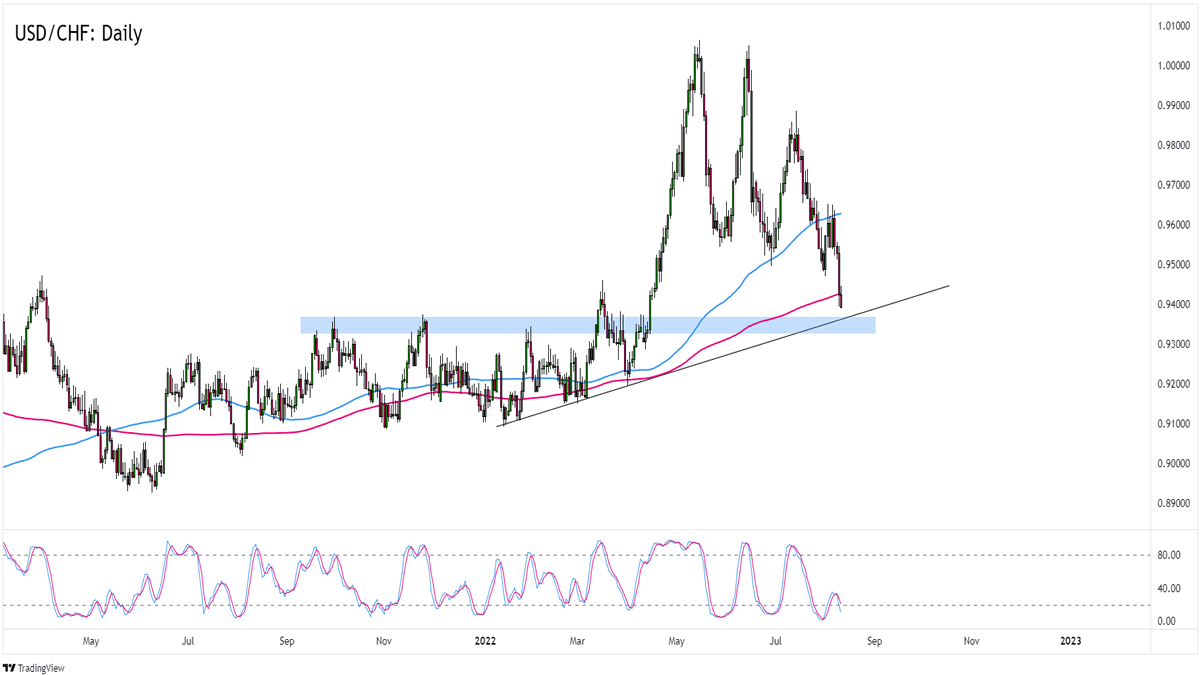 Klíčová slova: FOREX | USD/CHF | Indikátor | Měnový pár | Rezistence | Stochastic | Support | USD | CHF | Babypips | Graf | Throwback | Vývoj měnového páru | TradingView | Indikátor Stochastic | Denní graf | Pokles | Vývoj | Další pokles | Další růst | Růst | Oblasti rezistence | Přeprodané oblasti | Oslabení |