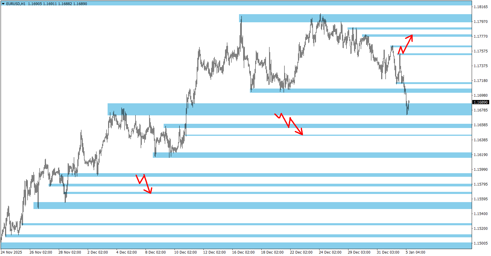Níže na grafu najdete mé aktuální Price Action S/R úrovně pro H1 time-frame a také obchodní nastavení - vyznačené šipky, k jakým S/R zónám by trh mohl směřovat (po jejich prolomení daným směrem). Jsou to mé obchody, které plánuji obchodovat a vše uveřejňuji s předstihem v tomto mém komentáři. Jde o můj obchodní systém (Breakout strategie Ondřeje Hartmana), kde šipkami vždy dopředu upozorním na oblasti, které budu obchodovat čekajícími pokyny prolomením jedné S/R zóny (pokud dojde k aktivaci a prolomení) a pohyb k další nejbližší. Dlouhodobá úspěšnost strategie je 80 % a najdete zde mou historii za více než 15 let.