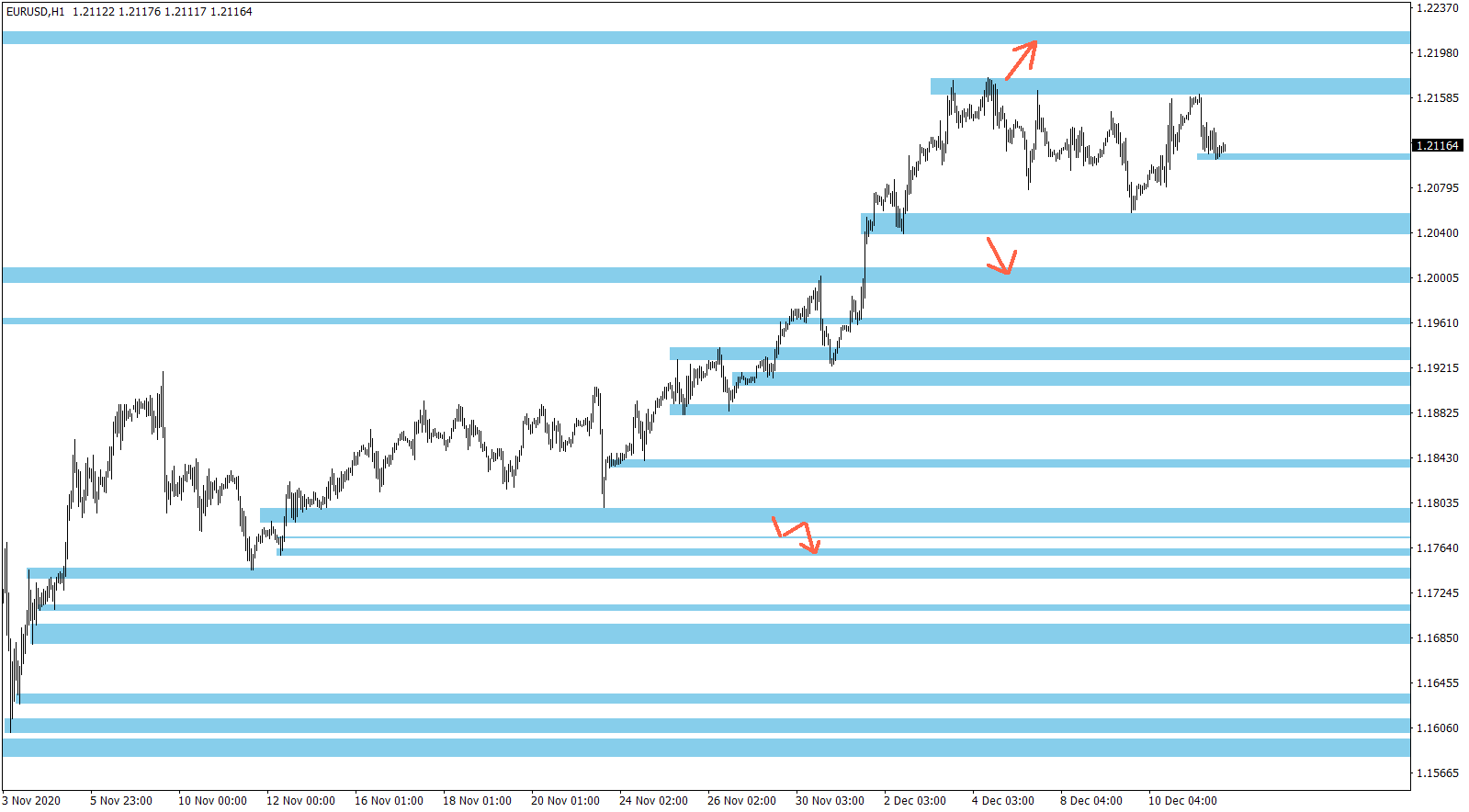 Nastavení mých S/R úrovní na měnovém páru EUR/USD (1hodinový graf – H1):