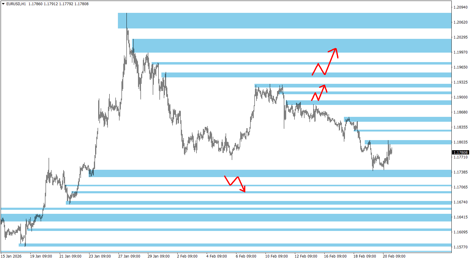 Níže na grafu najdete mé aktuální Price Action S/R úrovně pro H1 time-frame a také obchodní nastavení - vyznačené šipky, k jakým S/R zónám by trh mohl směřovat (po jejich prolomení daným směrem). Jsou to mé obchody, které plánuji obchodovat a vše uveřejňuji s předstihem v tomto mém komentáři. Jde o můj obchodní systém (Breakout strategie Ondřeje Hartmana), kde šipkami vždy dopředu upozorním na oblasti, které budu obchodovat čekajícími pokyny prolomením jedné S/R zóny (pokud dojde k aktivaci a prolomení) a pohyb k další nejbližší. Dlouhodobá úspěšnost strategie je 80 % a najdete zde mou historii za více než 15 let.