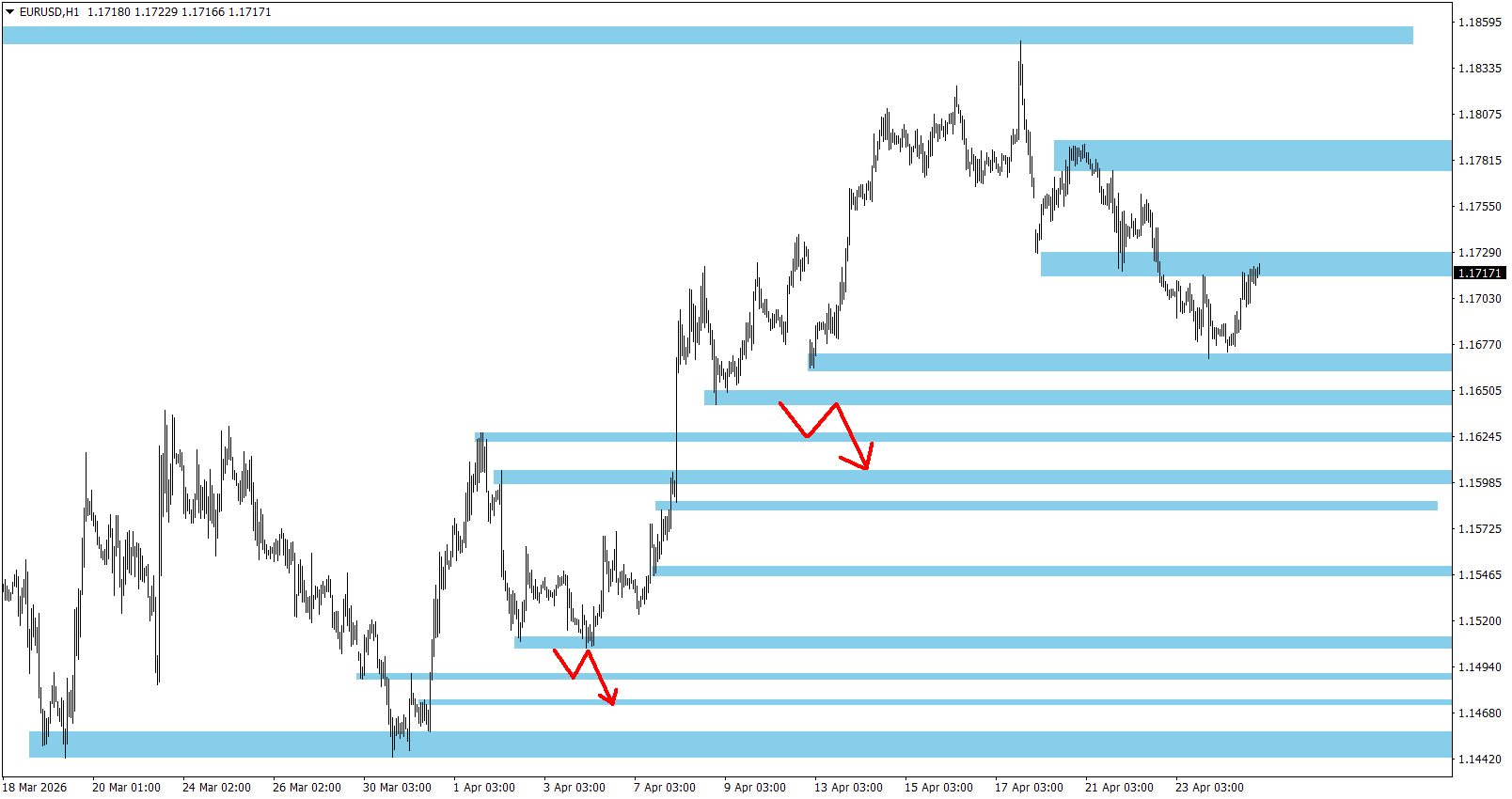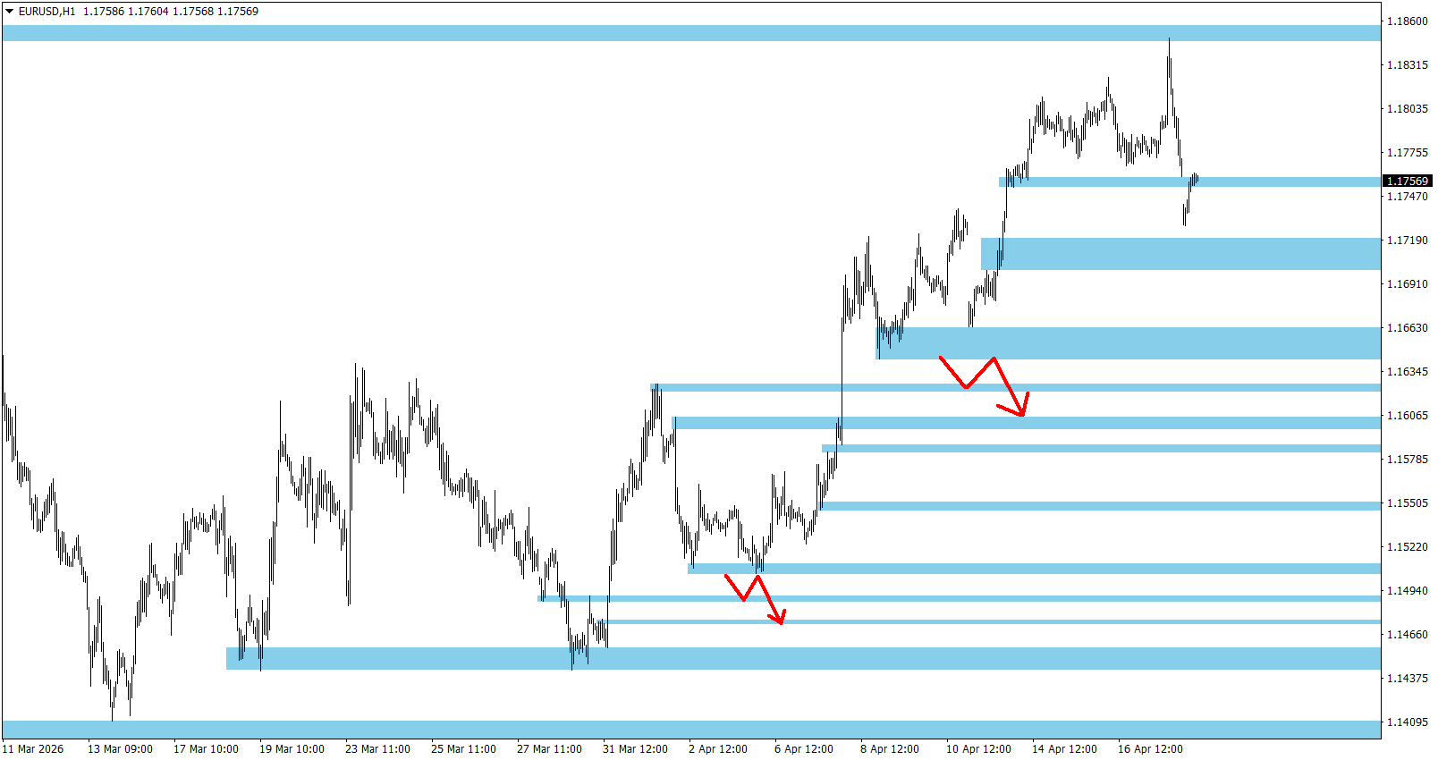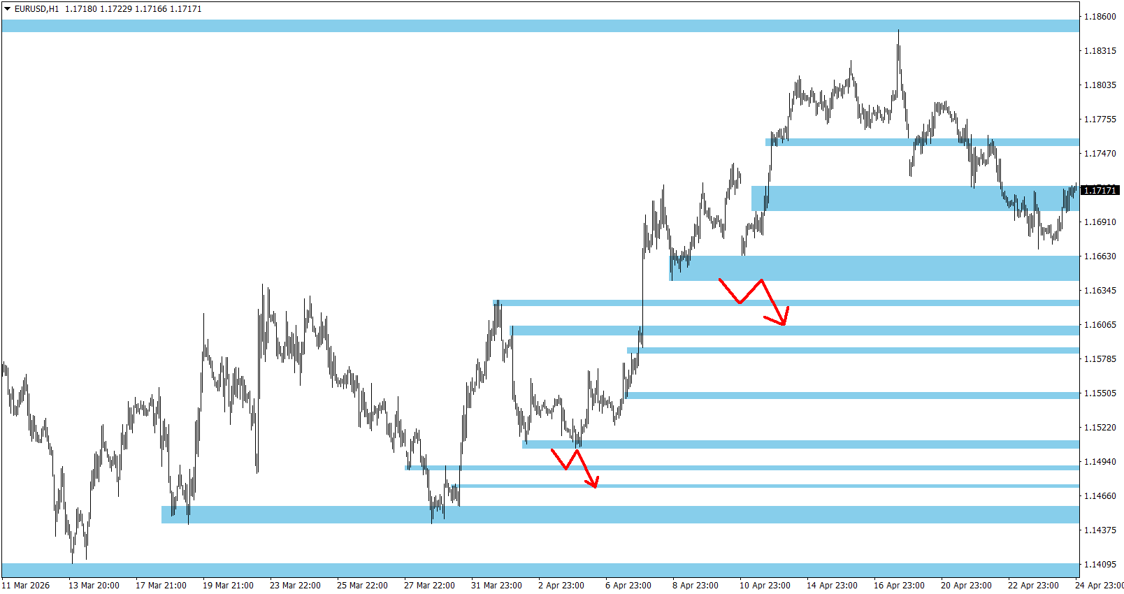 Níže na grafu najdete mé aktuální Price Action S/R úrovně pro H1 time-frame a také obchodní nastavení - vyznačené šipky, k jakým S/R zónám by trh mohl směřovat (po jejich prolomení daným směrem). Jsou to mé obchody, které plánuji obchodovat a vše uveřejňuji s předstihem v tomto mém komentáři. Jde o můj obchodní systém (Breakout strategie Ondřeje Hartmana), kde šipkami vždy dopředu upozorním na oblasti, které budu obchodovat čekajícími pokyny prolomením jedné S/R zóny (pokud dojde k aktivaci a prolomení) a pohyb k další nejbližší. Dlouhodobá úspěšnost strategie je 80 % a najdete zde mou historii za více než 15 let.
