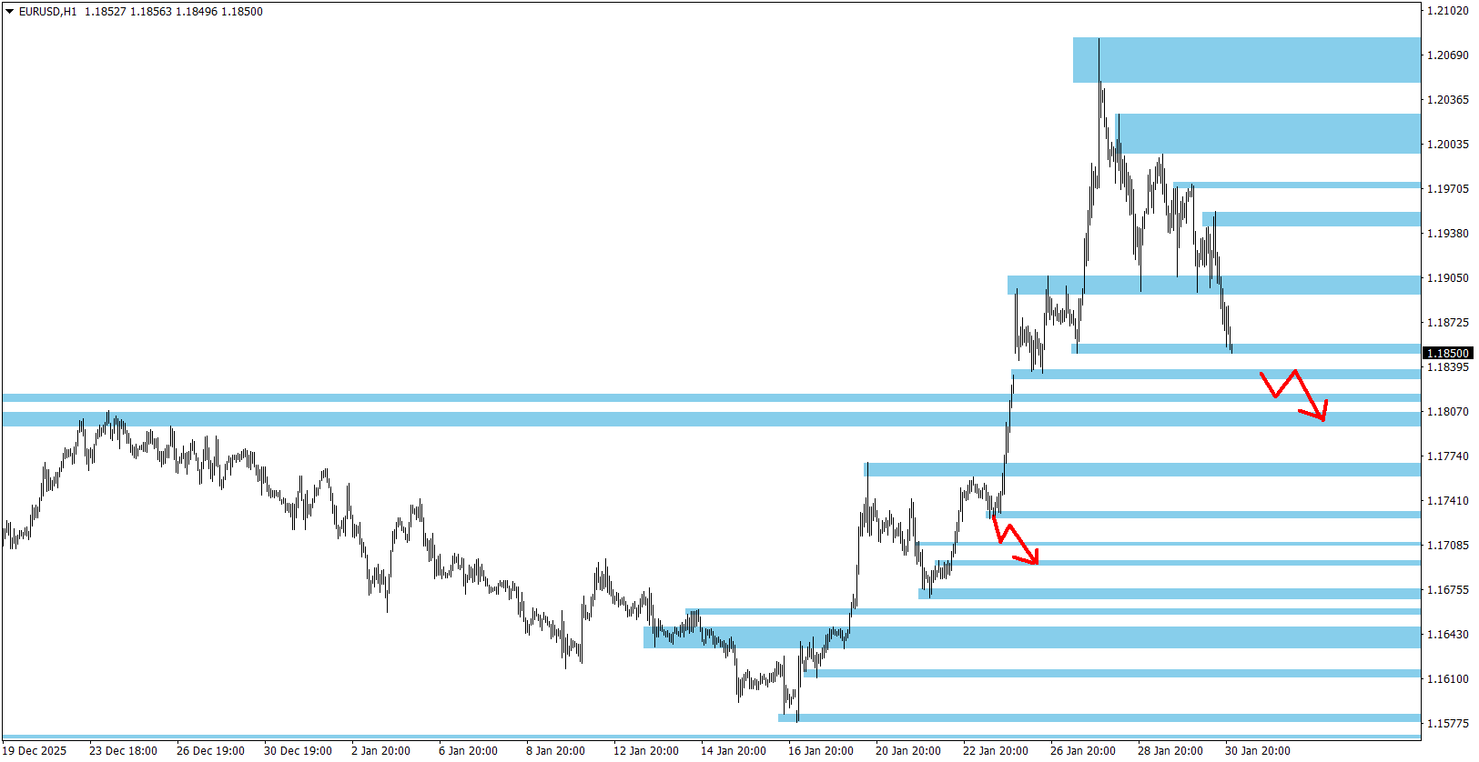 Níže na grafu najdete mé aktuální Price Action S/R úrovně pro H1 time-frame a také obchodní nastavení - vyznačené šipky, k jakým S/R zónám by trh mohl směřovat (po jejich prolomení daným směrem). Jsou to mé obchody, které plánuji obchodovat a vše uveřejňuji s předstihem v tomto mém komentáři. Jde o můj obchodní systém (Breakout strategie Ondřeje Hartmana), kde šipkami vždy dopředu upozorním na oblasti, které budu obchodovat čekajícími pokyny prolomením jedné S/R zóny (pokud dojde k aktivaci a prolomení) a pohyb k další nejbližší. Dlouhodobá úspěšnost strategie je 80 % a najdete zde mou historii za více než 15 let.