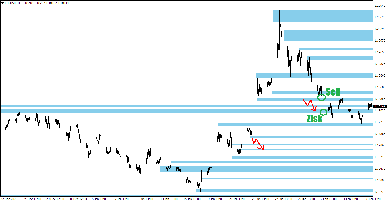 První týden roku 2023 začal velmi dobře a moje strategie zaznamenala pěkný zisk podle mého týdenního komentáře. Dočkali jsme se totiž prolomení spodní vstupní S/R zóny, což způsobilo vstup do short (sell) pozice podle mého očekávání. Následně se trh vydal přesně do mého předem vyznačeného cíle a obchod byl ukončen v zisku na Profit-Targetu. Pokud jste mého obchodu také využili ve svůj prospěch, tak gratuluji k zisku! -