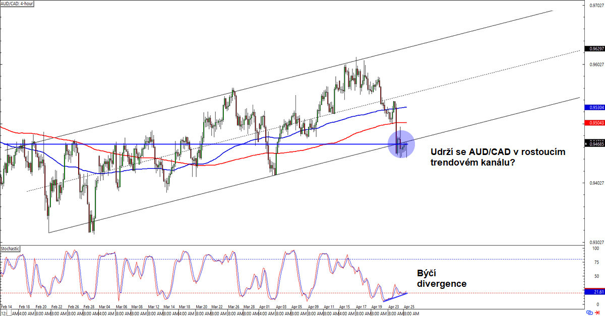Měnový pár AUD/CAD se na 4hodinovém grafu obchoduje v rostoucím trendovém kanálu a momentálně se nachází těsně nad jeho supportem, který koresponduje s klouzavými průměry SMA 100 a SMA 200. Indikátor Stochastic současně již vysílá přeprodané podmínky, a tak by se ke slovu mohli dostat opět býci. Bude se tedy tento měnový pár i nadále obchodovat v rostoucím trendovém kanálu? -