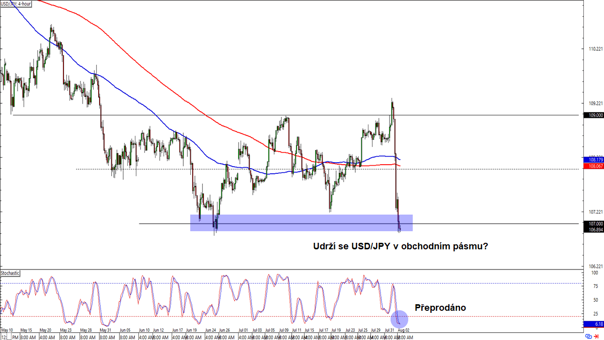 Měnový pár USD/JPY na 4hodinovém grafu aktuálně testuje support obchodního pásma kolem psychologické hladiny 107,00, kam se dostal po předchozím prudkém propadu. Indikátor Stochastic současně již vysílá přeprodané podmínky, což značí možnou vyčerpanost medvědů. Otevření dlouhé (long) pozice kolem současných úrovní tak může být dobrý obchodní plán, zejména pokud cílíte na rezistenci obchodního pásma kolem hladiny 109,00.