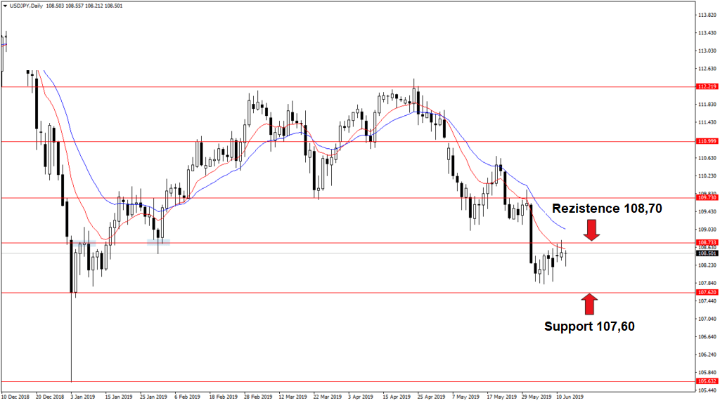 Měnový pár USD/JPY se na denním grafu obchoduje v klesajícím trendu. Včera se však pokusil o růst, ale nakonec nedokázal překonat směrem vzhůru rezistenci kolem hladiny 108,70 (dříve support) a naopak se odrazil zpět k nižším hodnotám. Udrží se tak tento měnový pár nadále v klesajícím trendu s možným otestováním supportu kolem hladiny 107,60?