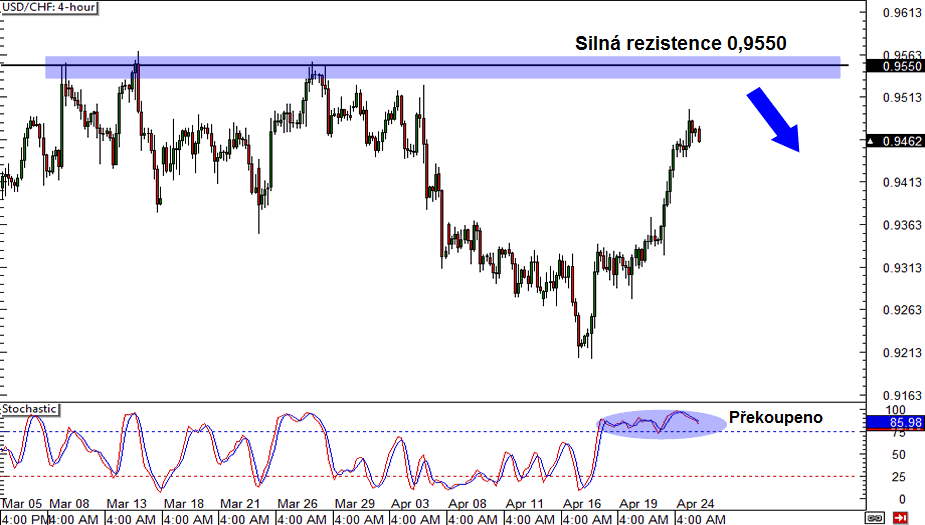 Měnový pár USD/CHF několik týdnů posiloval a nyní se na 4hodinovém grafu blíží k silné rezistenci 0,9550. Otázkou je, zda se cena začne od rezistence vracet zpět nebo vystoupá až nad ní. Stochastic je v překoupeném pásmu a signalizuje, že kupcům pomalu dochází dech.