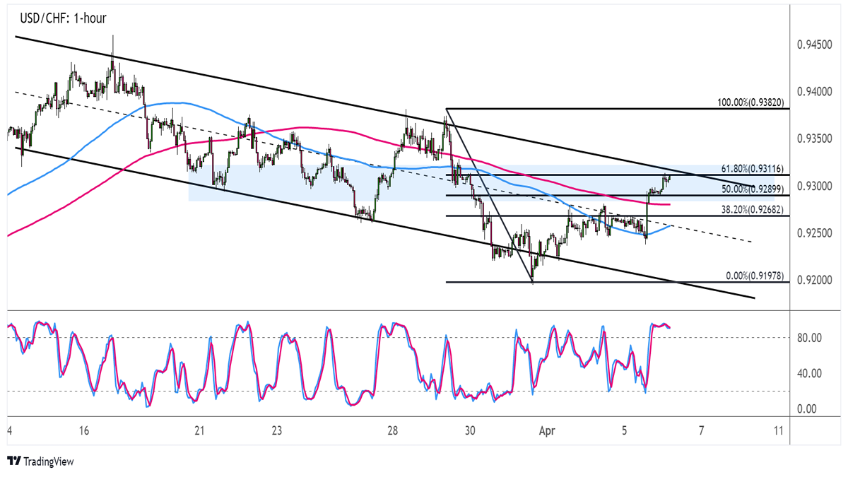 Měnový pár USD/CHF se na 1hodinovém grafu obchoduje v klesajícím trendovém kanálu. Poblíž rezistence horní hrany kanálu nyní dochází k otestování úrovně 61,8 % Fibonacciho retracementu. Zmíněná úroveň Fibonacciho retracementu se nachází uvnitř již dříve prolomené oblasti supportu (nyní rezistence). Indikátor Stochastic současně již vysílá překoupené podmínky, další růst by tak mohl být limitován. Najdou kolem současných úrovní znovu sílu medvědi a oslabíme zpět směrem k supportu trendového kanálu kolem hladiny 0,9200 nebo alespoň k jeho středové linii?