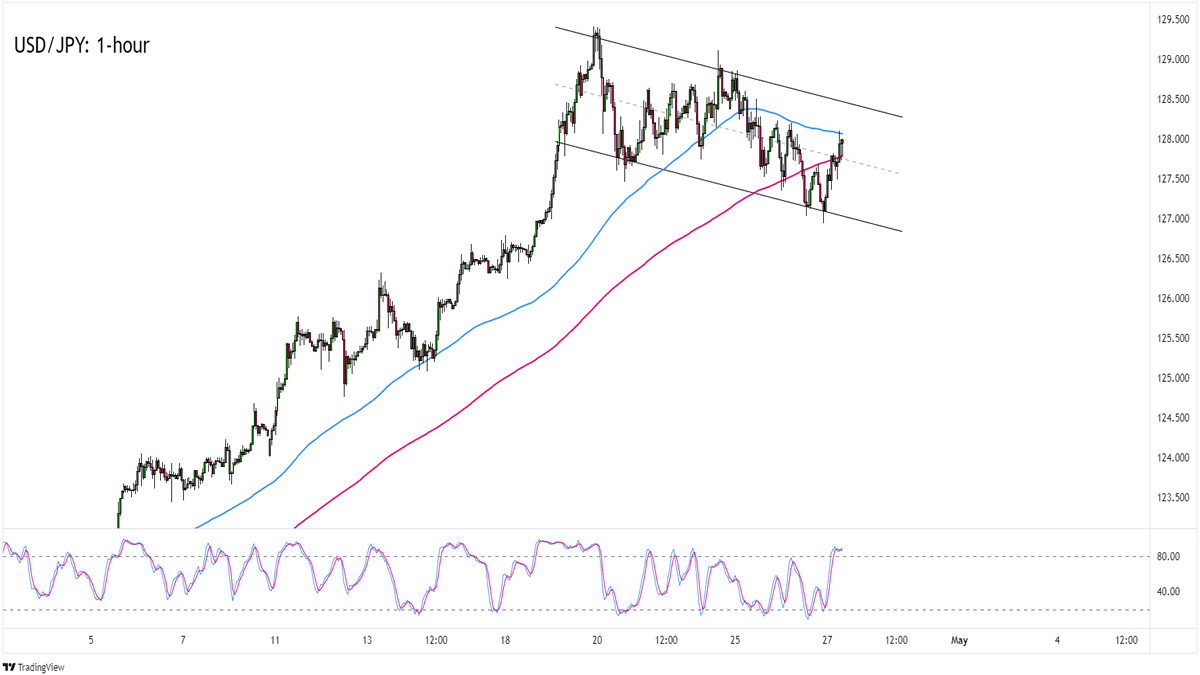 Měnový pár USD/JPY se na 1hodinovém grafu obchoduje v klesajícím trendovém kanálu a nyní se pohybuje poblíž jeho středové linie. Indikátor Stochastic současně již vysílá překoupené podmínky, což značí možnou vyčerpanost býků. Dočkáme se tedy posílení a otestovaní rezistence, nebo naopak dojde k oslabení a otestování supportu trendového kanálu?