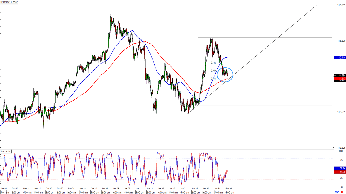 Měnový pár USD/JPY se na 1hodinovém grafu přibližuje k supportu rostoucí trendové linie a nyní dochází k otestování úrovně 50 % Fibonacciho retracementu, která koresponduje s klouzavým průměrem SMA 200. Dočkáme se tedy odrazu od zmíněné úrovně a následného růstu, nebo dojde k průrazu a otestování nižších úrovní?
