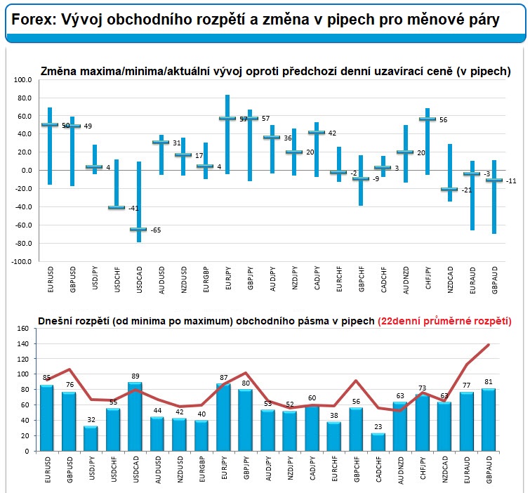 Většina měnových párů se dnes nachází pod svým 22denním průměrným rozpětím. Svůj průměr mírně překračují pouze měnové páry EUR/GBP a GBP/CHF. -