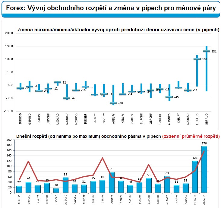 Několik měnových párů se dnes přibližuje svému 22dennímu průměrnému rozpětí nebo ho překračuje. Výrazněji svůj průměr překonávají měnové páry GBP/USD, GBP/JPY, GBP/CHF a EUR/AUD. -