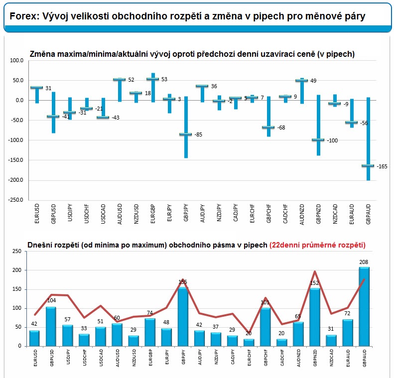 Měnové páry se během dnešního obchodování nachází pod svým 22denním průměrným rozpětím. Výjimku tvoří pouze měnový pár GBP/AUD, který své průměrné rozpětí dnes překračuje.