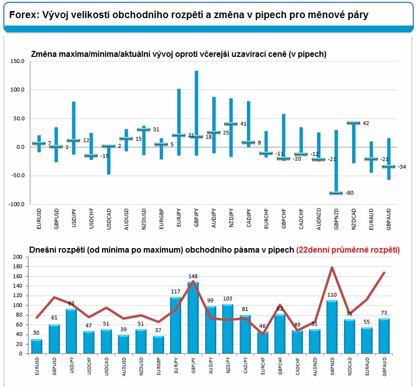 Většina měnových párů se dnes nachází v blízkosti svého 22denního průměrného rozpětí. Svůj průměr překonávají nejvýrazněji měnové páry AUD/JPY, AUD/NZD a EUR/AUD. -