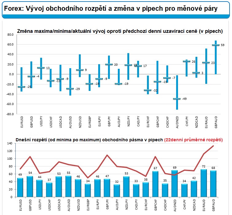Většina měnových párů se dnes nachází pod svým 22denním průměrným rozpětím. Jedinou výjimkou je měnový pár AUD/NZD, který svůj průměr mírně překračuje.