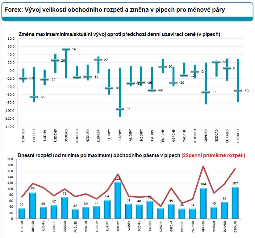 Většina měnových párů se dnes nachází pod svým 22denním průměrným rozpětím. Na svůj průměr dosahuje pouze měnový pár EUR/GBP. -