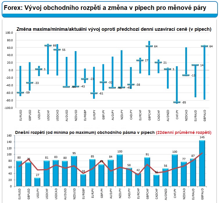 Většina měnových párů se dnes nachází pod svým 22denním průměrným rozpětím. Své průměry naopak mírně překračují některé měnové páry se švýcarským frankem (USD/CHF, EUR/CHF a GBP/CHF), který je dnes zároveň nejsilnější měnou. -
