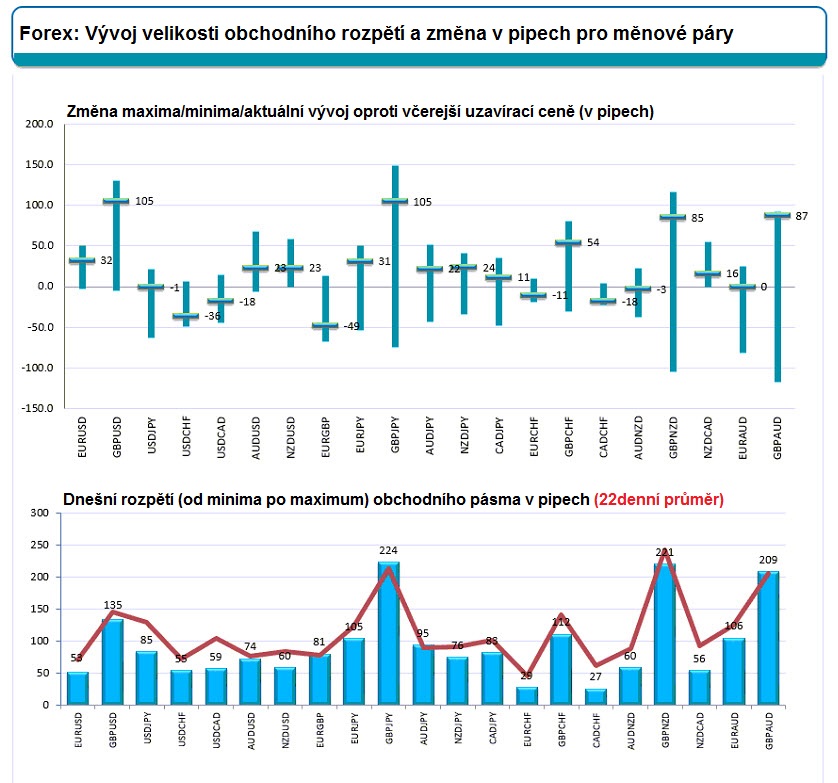 Většina měnových párů se dnes nachází pod svým 22denním průměrným rozpětím. Na své průměry dosahují nebo je překonávají měnové páry EUR/USD, GBP/USD, USD/CHF, EUR/GBP, EUR/JPY, CAD/CHF a CHF/JPY. -