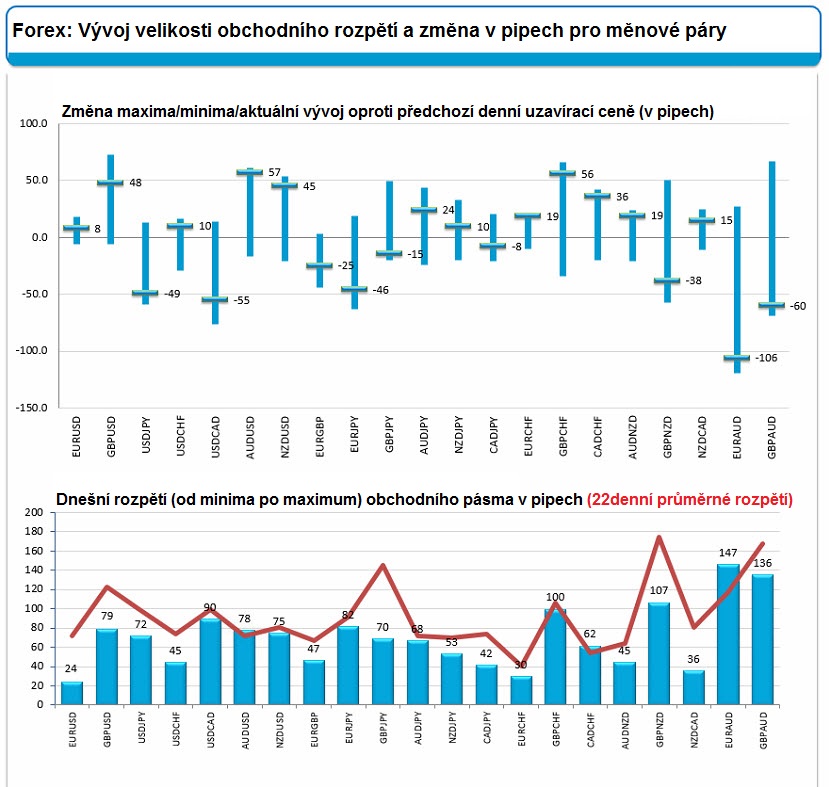 Většina měnových párů se dnes nachází pod svým 22denním průměrným rozpětím. Na své průměry dosahují nebo je překonávají měnové páry USD/CHF, AUD/USD, NZD/USD, EUR/CHF a EUR/AUD. -