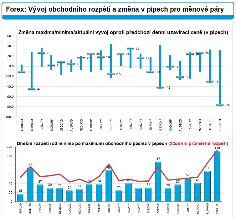 Většina měnových párů se dnes nachází pod svým 22denním průměrným rozpětím. Na své průměry dosahují nebo je překonávají pouze měnové páry GBP/CHF a CHF/JPY.