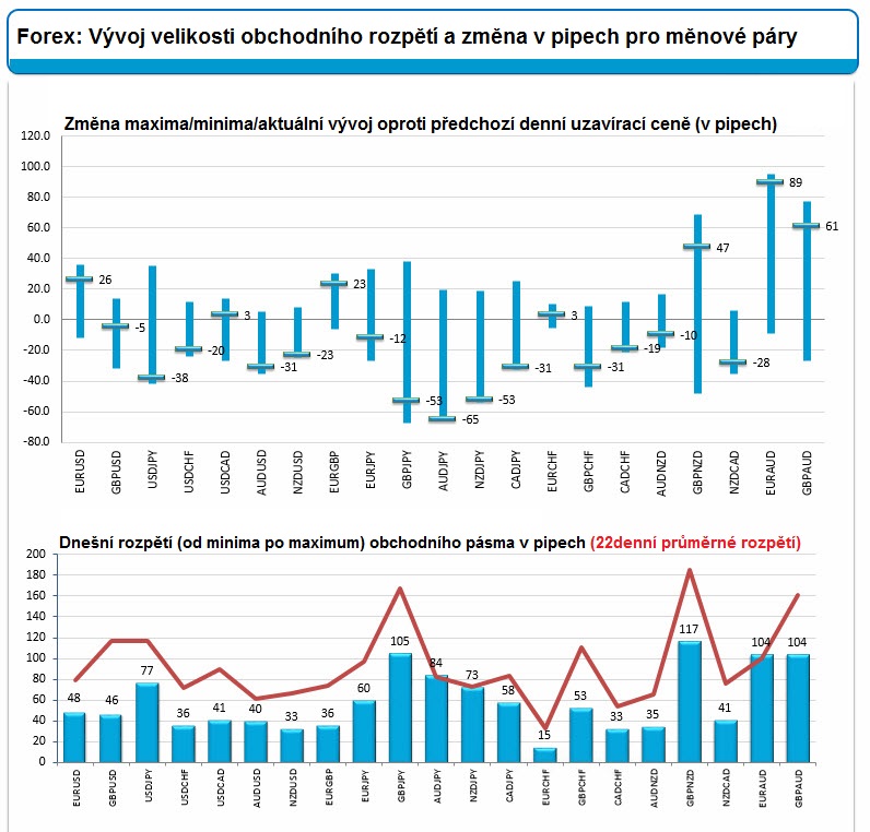 Většina měnových párů dnes dosahuje na své 22denní průměrné rozpětí nebo ho překračuje (některé měnové páry velmi výrazně). Volatilita je tak na zvýšené úrovni. -