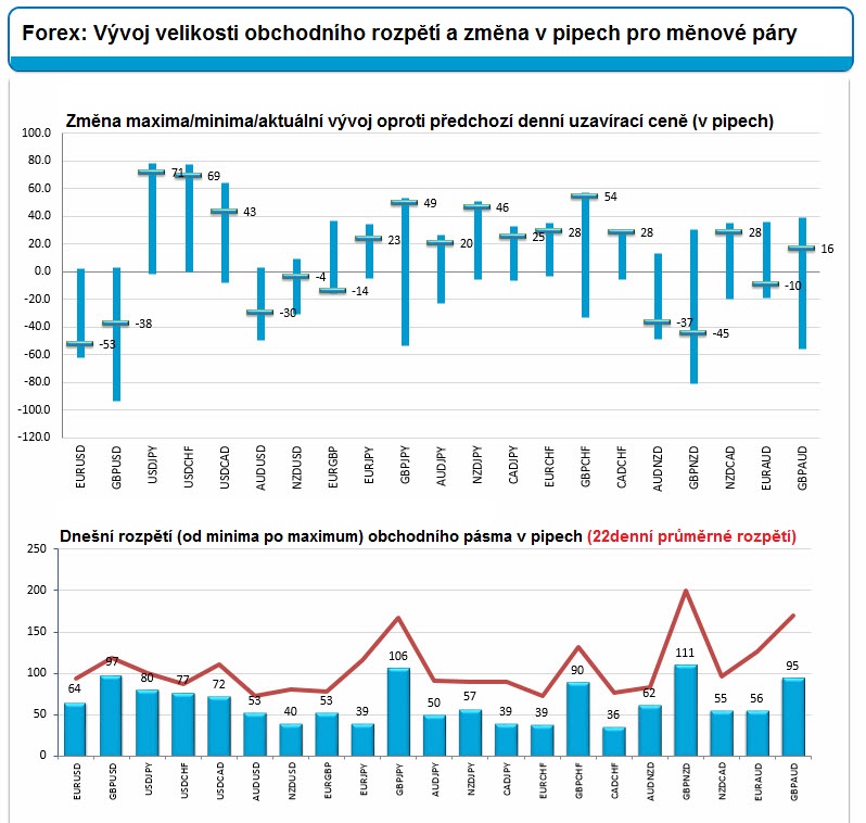 Většina měnových párů se dnes nachází pod svým 22denním průměrným rozpětím. Svůj průměr dnes překračují pouze měnový pár USD/CHF a velmi mírně také EUR/CHF. -