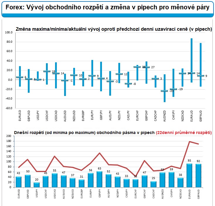 Většina měnových párů se dnes nachází pod svým 22denním průměrným rozpětím. Výjimku tvoří měnový pár EUR/CHF, který svůj průměr mírně překračuje. -