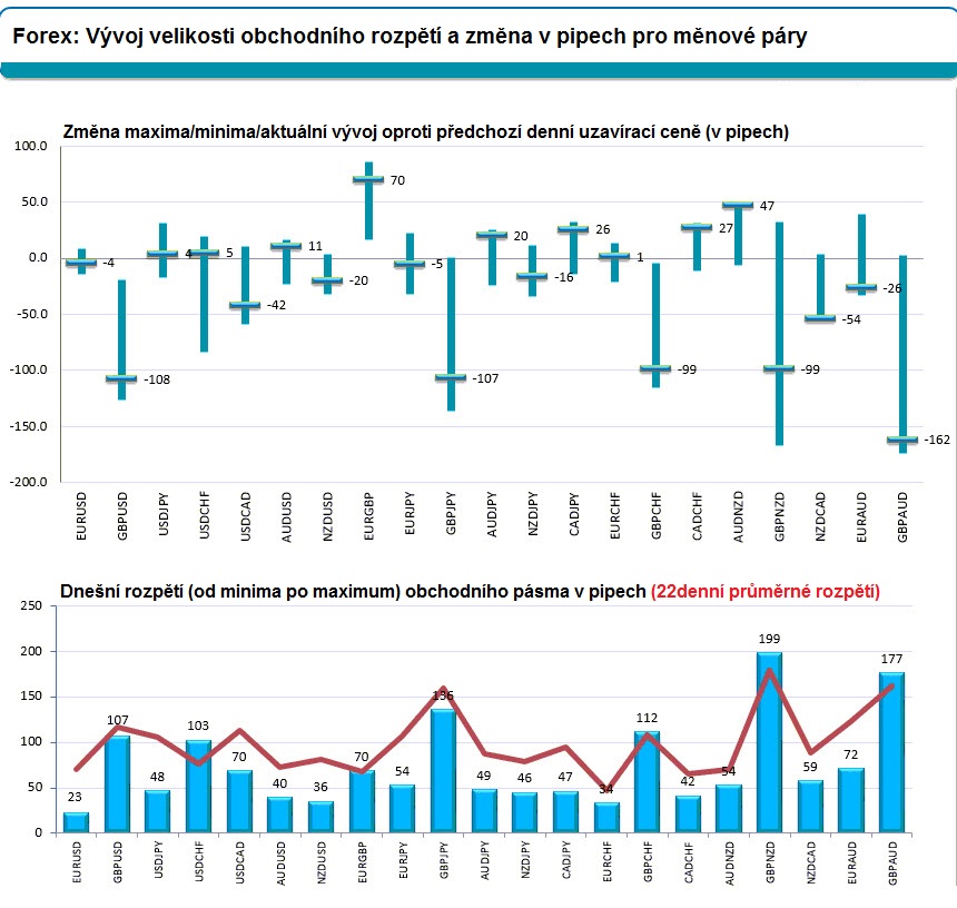 Měnový pár EUR/USD se dnes i díky státnímu svátku v Německu obchoduje v úzkém obchodním pásmu a hluboko pod svým 22denním průměrným rozpětím. Naopak své průměrné rozpětí dnes atakují nebo přesahují měnové páry USD/CHF, EUR/GBP, GBP/CHF, GBP/NZD a GBP/AUD.