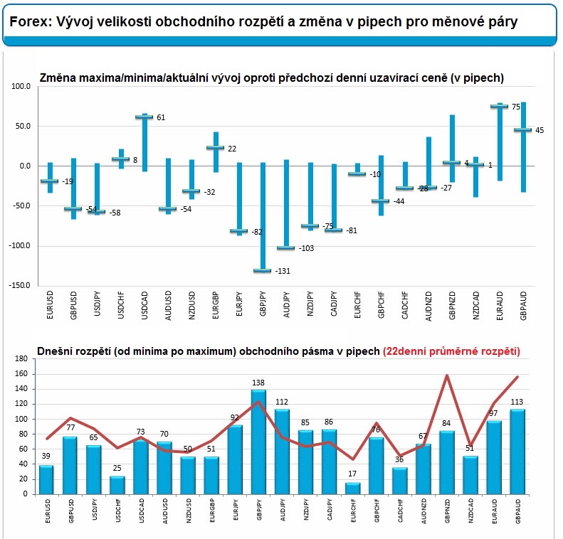 Část měnových párů během dnešního obchodování atakuje nebo mírně překračuje své 22denní průměrné rozpětí (červená křivka). Měnové páry s japonským jenem se obchodují v blízkosti svých dnešních minim.