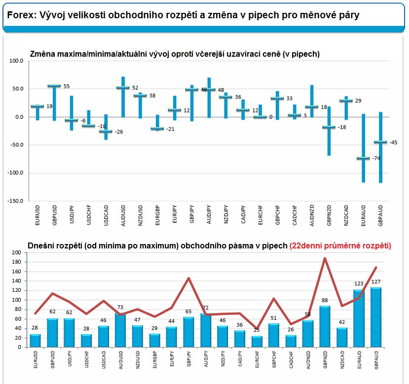 Většina měnových párů se dnes nachází pod svým 22denním průměrným rozpětím. Na své průměry dosahují nebo je mírně překonávají měnové páry EUR/JPY, GBP/JPY a EUR/CHF. -