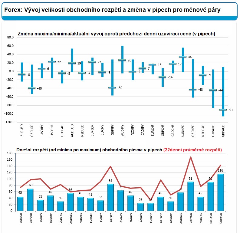 Měnové páry se během dnešního obchodování znovu nachází pod svým 22denním průměrným rozpětím. Nejblíže se svému průměrnému rozpětí přibližuje měnový pár AUD/USD.