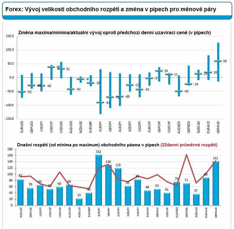 Několik měnových párů se dnes přibližuje svému 22dennímu průměrnému rozpětí nebo ho mírně překračuje. O něco výrazněji svůj průměr překonávají měnové páry GBP/CHF a GBP/AUD. -