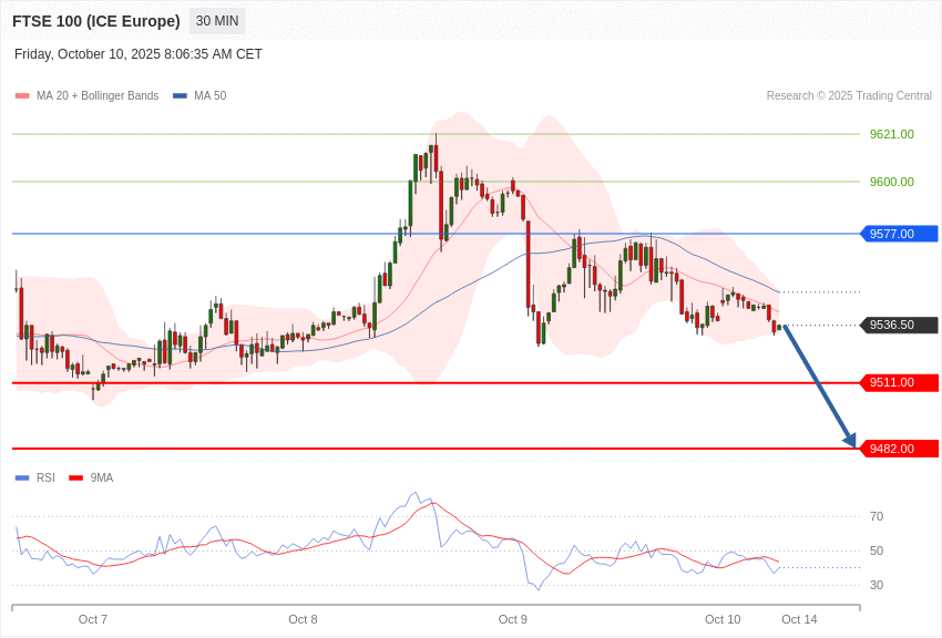 Komentář: Dokud se index FTSE 100 bude obchodovat pod rezistencí 9577, tak je pravděpodobný pohyb do strany s mírnou medvědí tendencí.
