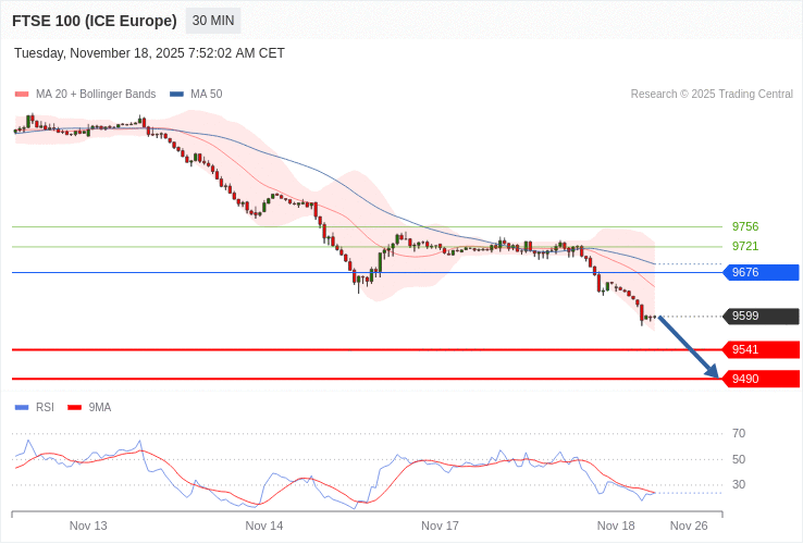 Klíčová slova: Intradenní výhled | Indikátor | Pozice | RSI | Rezistence | Short | Trading | FTSE | Pivot | Trading Central | Supporty a rezistence | FTSE 100 | Výhled | Krátké (short) pozice | Pokles | Medvědi | Indikátor RSI | Další pokles | Růst | Supporty |