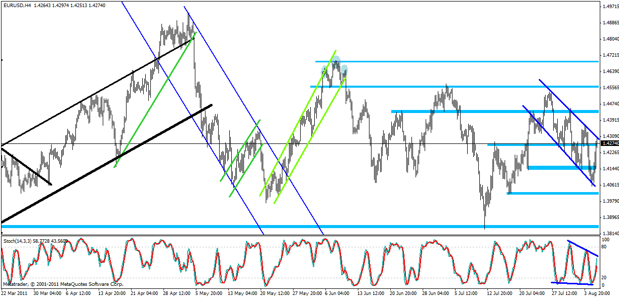 Situace a další vývoj na EUR/USD je tedy nyní neznámá a bude záležet na fundamentálních zprávách, jelikož EUR (eurozóna) i USD (USA) mají problémů více než dost. USA na jednu stranu v pátek překvapilo pozitivními daty (NFP report) ale na druhou stranu budou investoři reagovat na snížení ratingu Spojených států (ostatní 2 ratingové agentury ale nejvyšší rating potvrdily) a z eurozóny budou investoři vyhlížet rozhodnutí o tom, jestli ECB bude skupovat Italské a Španělské dluhopisy, aby se zabránilo šíření krize v eurozóně.