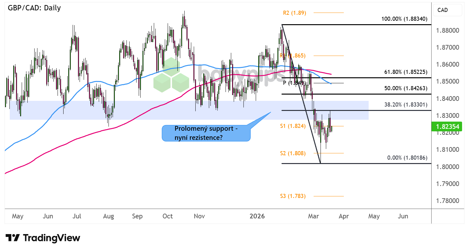 Měnový pár GBP/CAD se na denním grafu aktuálně přiblížil k již dříve prolomené oblasti supportu (pullback – nyní rezistence) na psychologické hladině 1,8300, která zároveň koresponduje s úrovní 38,2 % Fibonacciho retracementu. Dočkáme se nyní odrazu pullback a čeká nás další pokles?