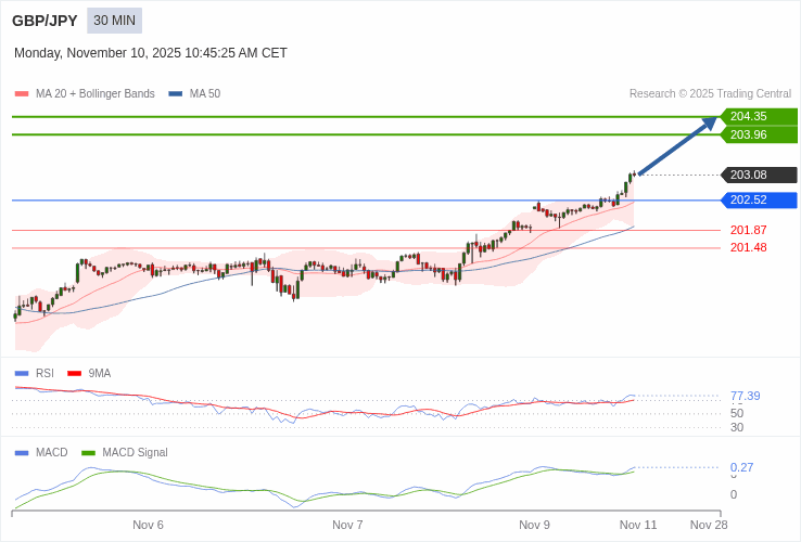 Preferovaný scénář: Dlouhé (long) pozice nad 202,52 s cílem na 203,96 a dále pak až na 204,35.