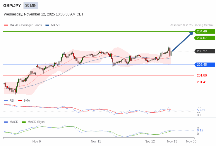 Preferovaný scénář: Dlouhé (long) pozice nad 202,45 s cílem na 204,07 a dále pak až na 204,46.