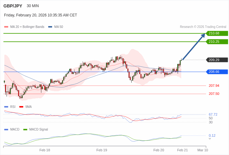 Preferovaný scénář: Dlouhé (long) pozice nad 208,66 s cílem na 210,25 a dále pak až na 210,68.