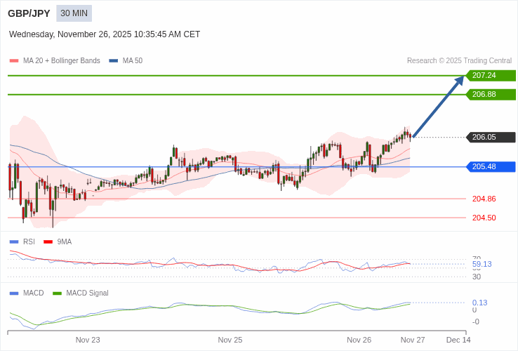 Preferovaný scénář: Dlouhé (long) pozice nad 205,48 s cílem na 206,88 a dále pak až na 207,24.