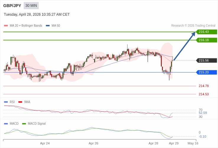Klíčová slova: Intradenní výhled | GBP/JPY | Indikátor | Long | Pozice | RSI | Rezistence | Trading | JPY | GBP | Pivot | Trading Central | Supporty a rezistence | Výhled | Pokles | Indikátor RSI | Dlouhé (long) pozice | Supporty |