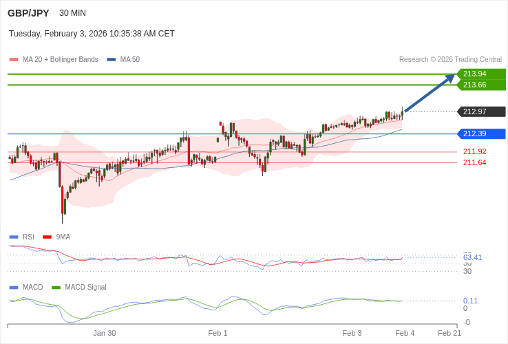 Preferovaný scénář: Dlouhé (long) pozice nad 212,39 s cílem na 213,66 a dále pak až na 213,94.