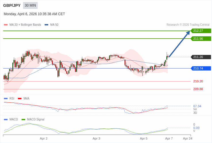 Preferovaný scénář: Dlouhé (long) pozice nad 210,74 s cílem na 211,96 a dále pak až na 212,27.