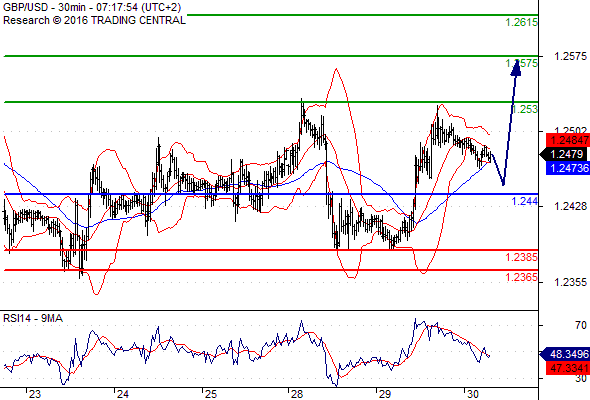 Preferovaný scénář: Dlouhé (long) pozice nad 1,2440 s cílem na 1,2530 a dále pak až na 1,2575.
