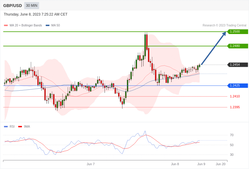 Preferovaný scénář: Dlouhé (long) pozice nad 1,2425 s cílem na 1,2480 a dále pak až na 1,2500.