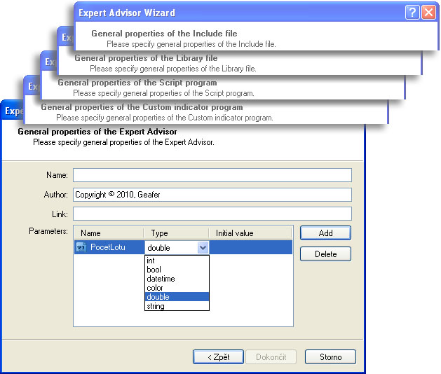 Výše uvedené typy programů založíte kliknutím na New z menu File. Spustíte tak jednoduchého průvodce, který je pro všechny typy stejný, pouze u indikátorů a EA lze zadávat vstupní parametry, u ostatních tato možnost z důvodu účelnosti není.